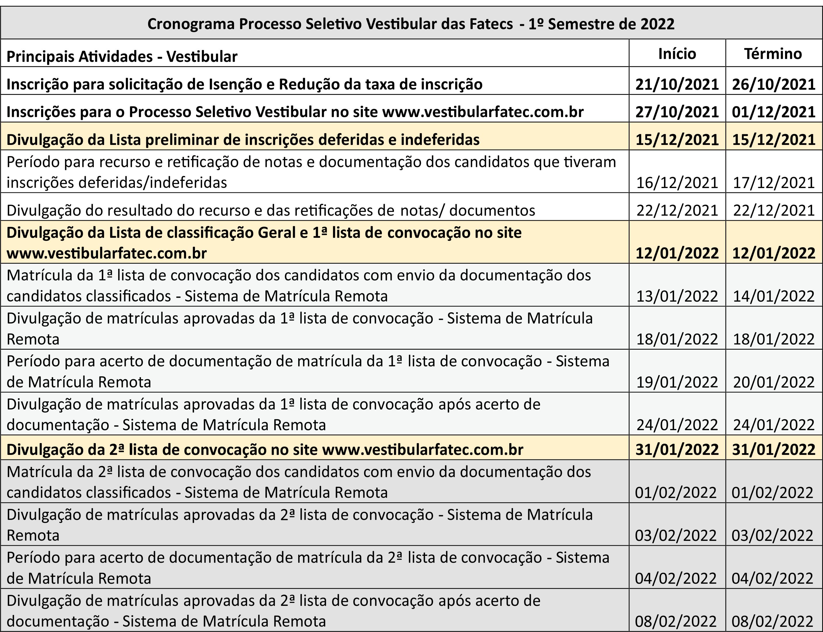 Cronograma Processo Seletivo Vestibular 1º Semestre 2022
